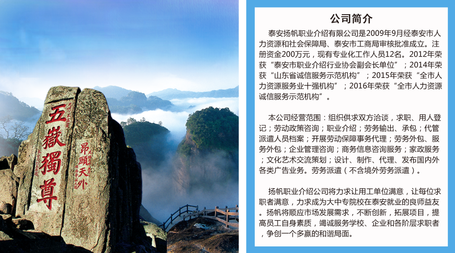 泰安揚(yáng)帆職業(yè)介紹有限公司是2009年9月經(jīng)泰安市人力資源和社會(huì)保障局、泰安市工商局審核批準(zhǔn)成立。注冊(cè)資金200萬元,現(xiàn)有專業(yè)化工作人員12名。2012年榮獲“泰安市職業(yè)介紹行業(yè)協(xié)會(huì)副會(huì)長單位”;2014年榮獲“山東省誠信服務(wù)示范機(jī)構(gòu)”;2015年榮獲“全市人力資源服務(wù)業(yè)十強(qiáng)機(jī)構(gòu)”;2016年榮獲“全市人力資源誠信服務(wù)示范機(jī)構(gòu)”。